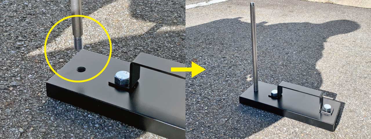 - センターピンとクロスするように、スライドプレートの小さい方の穴にスライドアームを取り付けます。